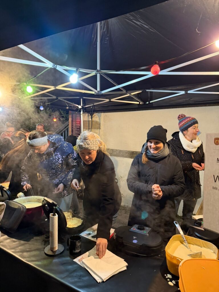 Auf dem Parkplatz der Wendelinskirche erwartete die Besucherinnen und Besucher ein gemütlicher Ausklang. Bei Wurst und Waffeln sowie Glühwein und Kinderpunsch kam man ins Gespräch und genoss die gesellige Stimmung. Für die musikalische Begleitung sorgte der Posaunenchor, der vor der Kirche mehrere stimmungsvolle Stücke darbot.