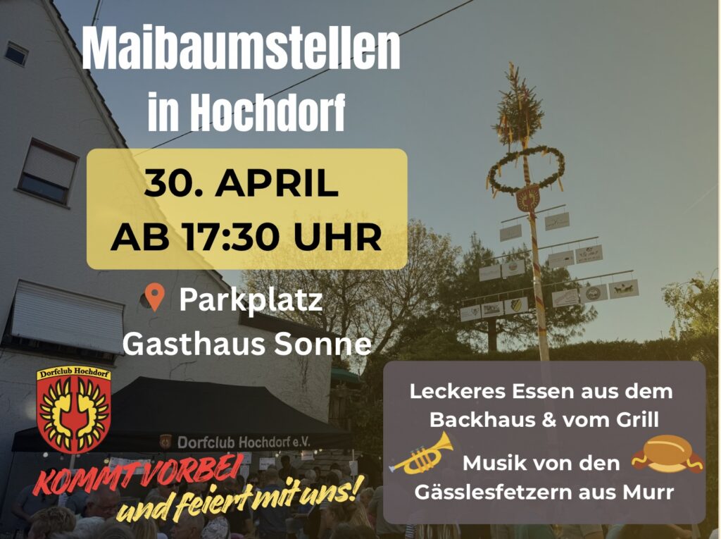 Am 30.04. laden wir euch herzlich zum traditionellen Maibaumstellen auf dem Parkplatz des Gasthauses Sonne ein!